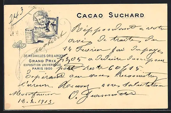 Lithographie Kleines Mädchen mit einer Dose Cacao Suchard