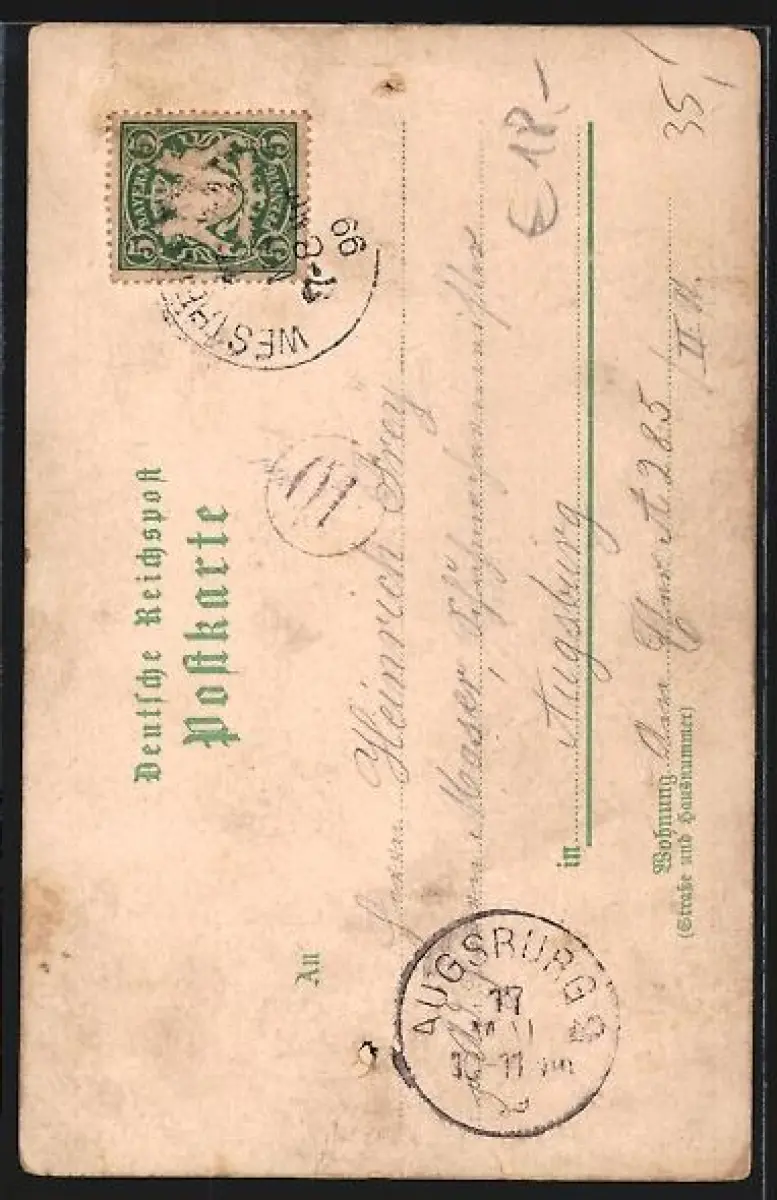 gelaufen 1899, Stecknadellöcher oben u. unten mittig, guter Zustand