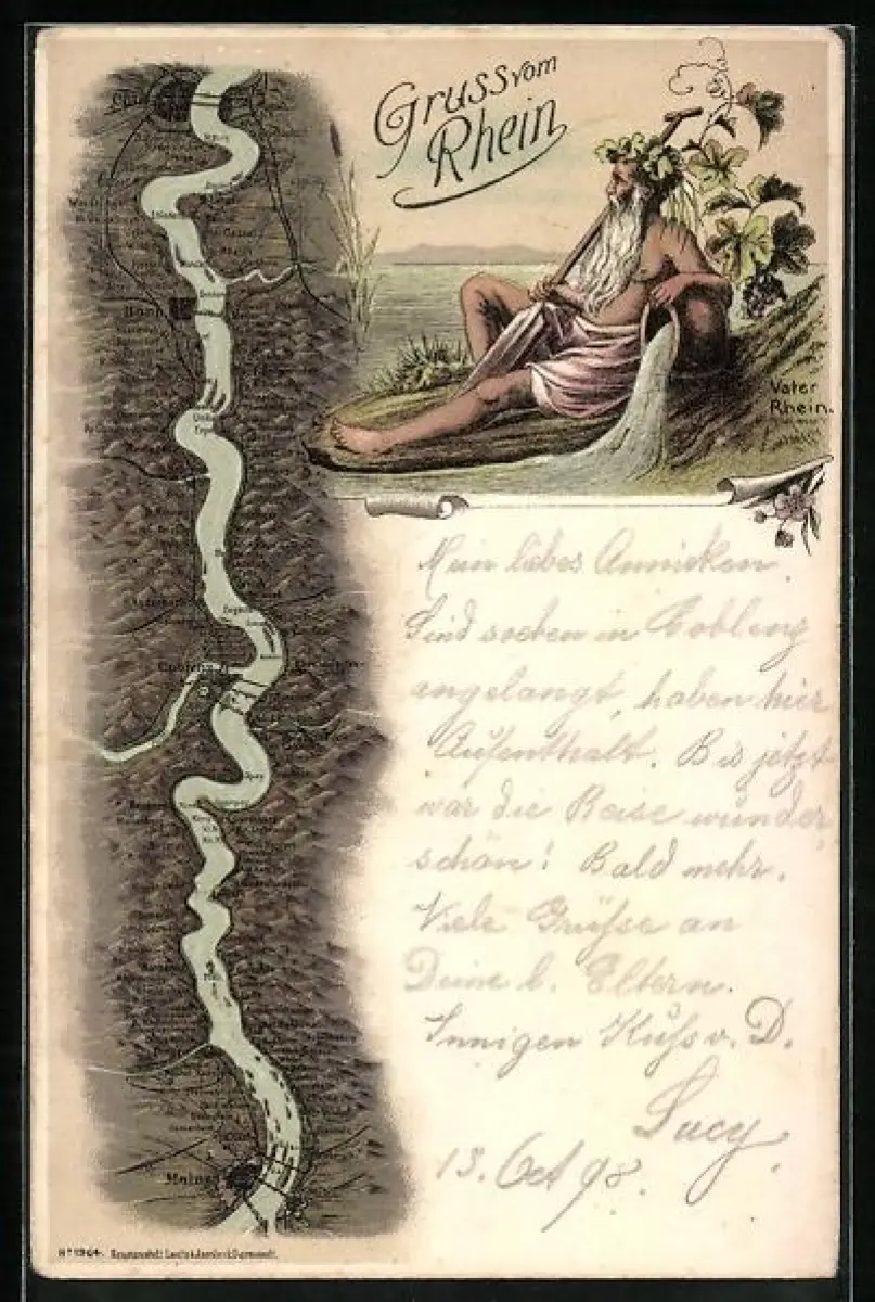 Lithographie Koblenz, Landkarte und Vater Rhein mit Weinreben