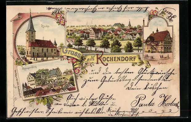 Lithographie Kochendorf, Zwingenberg, Kirche, Rathaus