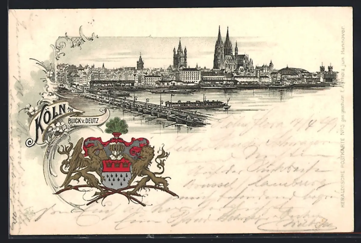 Lithographie Köln, Blick von Deutz auf die Altstadt, Wappen