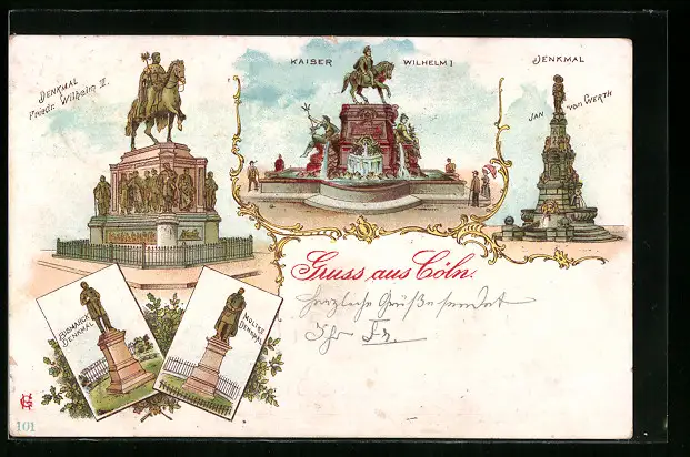 Lithographie Köln, Denkmal Kaiser Wilhelm I., Denkmal Jan van Werth, Bismarck- und Moltke-Denkmal