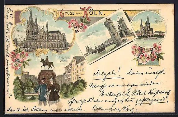 Lithographie Köln, Eisenbahnbrücke, Friedrich-Wilhelm-Denkmal, Dom