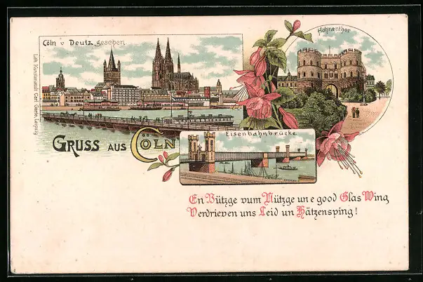 Lithographie Köln, Hahnentor, Eisenbahnbrücke, Teilansicht mit Dom
