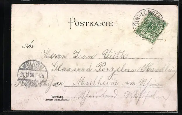 Personenbezogene Daten auf der Rückseite der Karte wurden durch blauen Textmarker unkenntlich gemacht. Die blauen Stellen sind auf die Vorderseite durchgeweicht und wirken sich negativ auf das Postkartenfoto aus