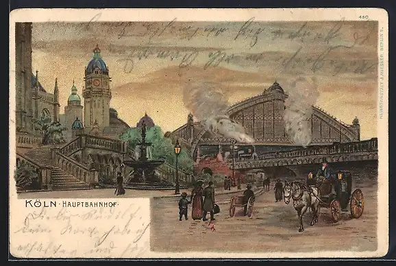 Lithographie Köln, Ortsansicht mit Hauptbahnhof