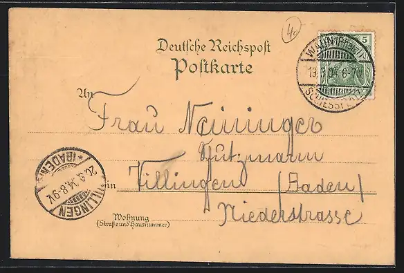 Personenbezogene Daten auf der Rückseite der Karte wurden durch blauen Textmarker unkenntlich gemacht. Die blauen Stellen sind auf die Vorderseite durchgeweicht und wirken sich negativ auf das Postkartenfoto aus
