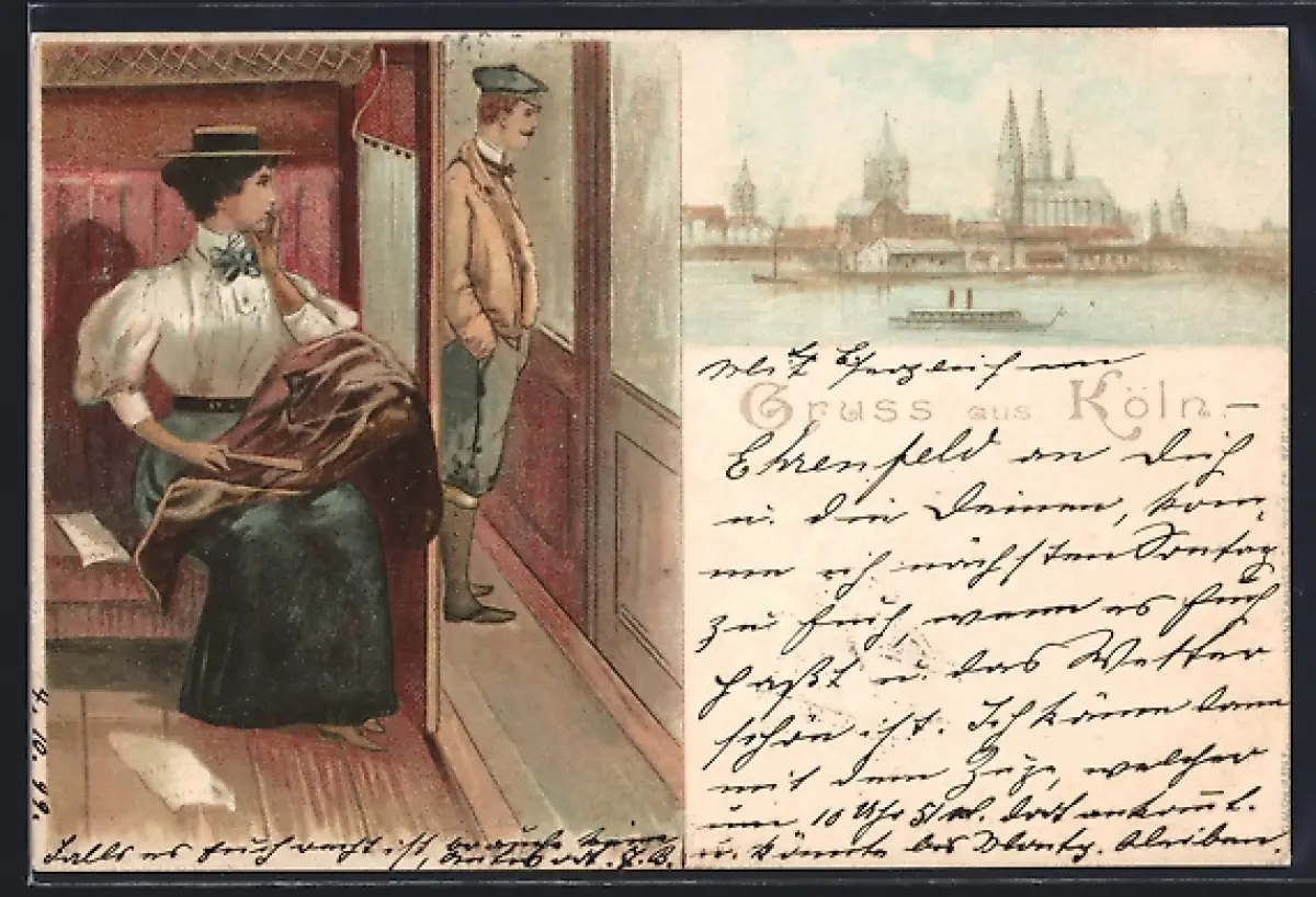 Lithographie Köln, Uferpartie mit Dom, Frau im Bahnabteil