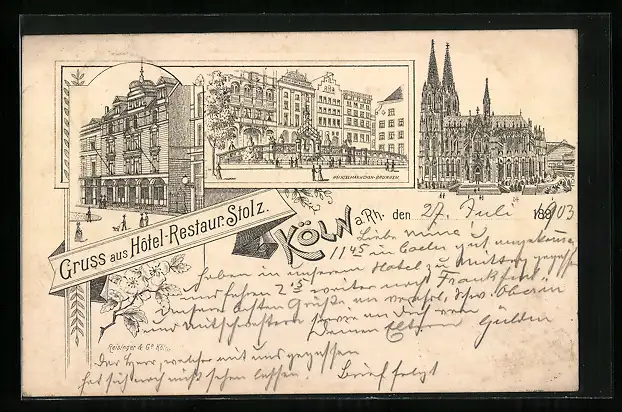 Lithographie Köln a. Rh., Hotel-Restaurant Stolz, Heinzelmännchen-Brunnen, Dom