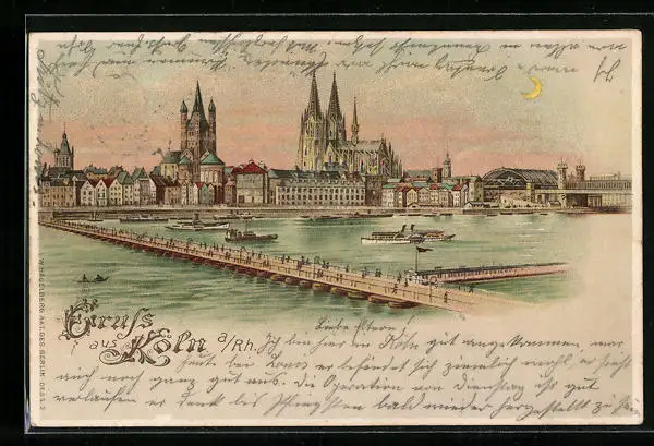 Lithographie Köln a. Rh., Uferpartie mit Dom und Brücke bei Mondschein, Halt gegen das Licht