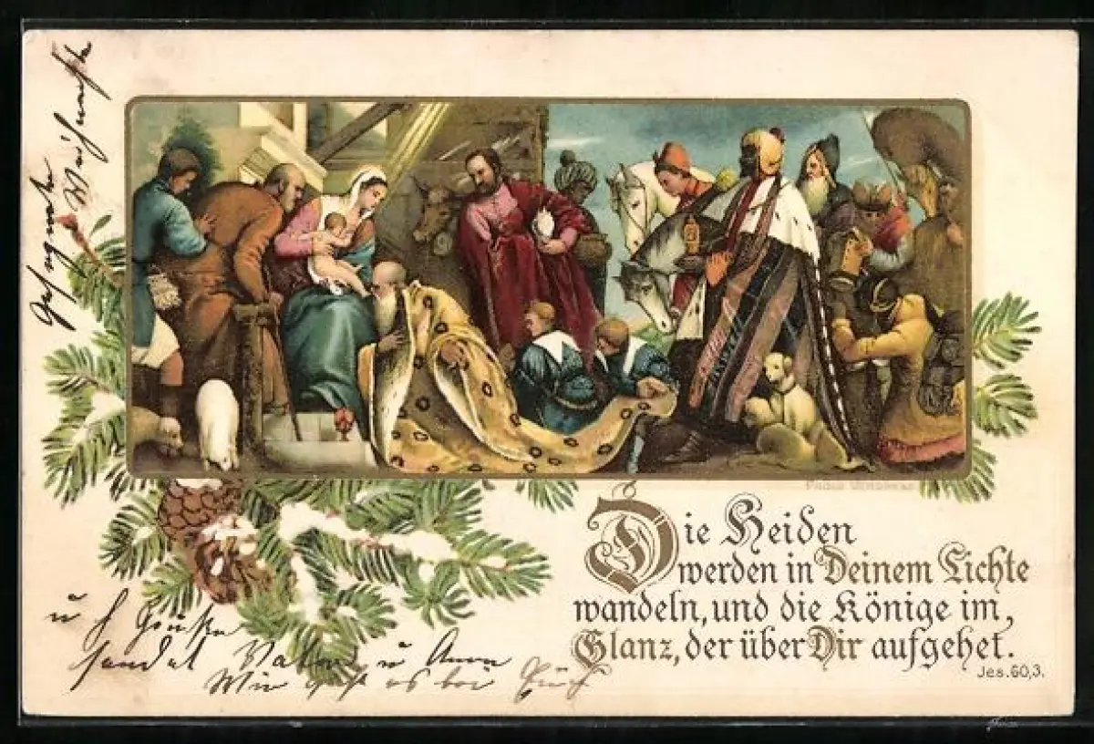 Lithographie Könige in Jesus Stall, Sinnspruch Die Heiden werden in deinem Lichte Wandeln, Jes. 60,3