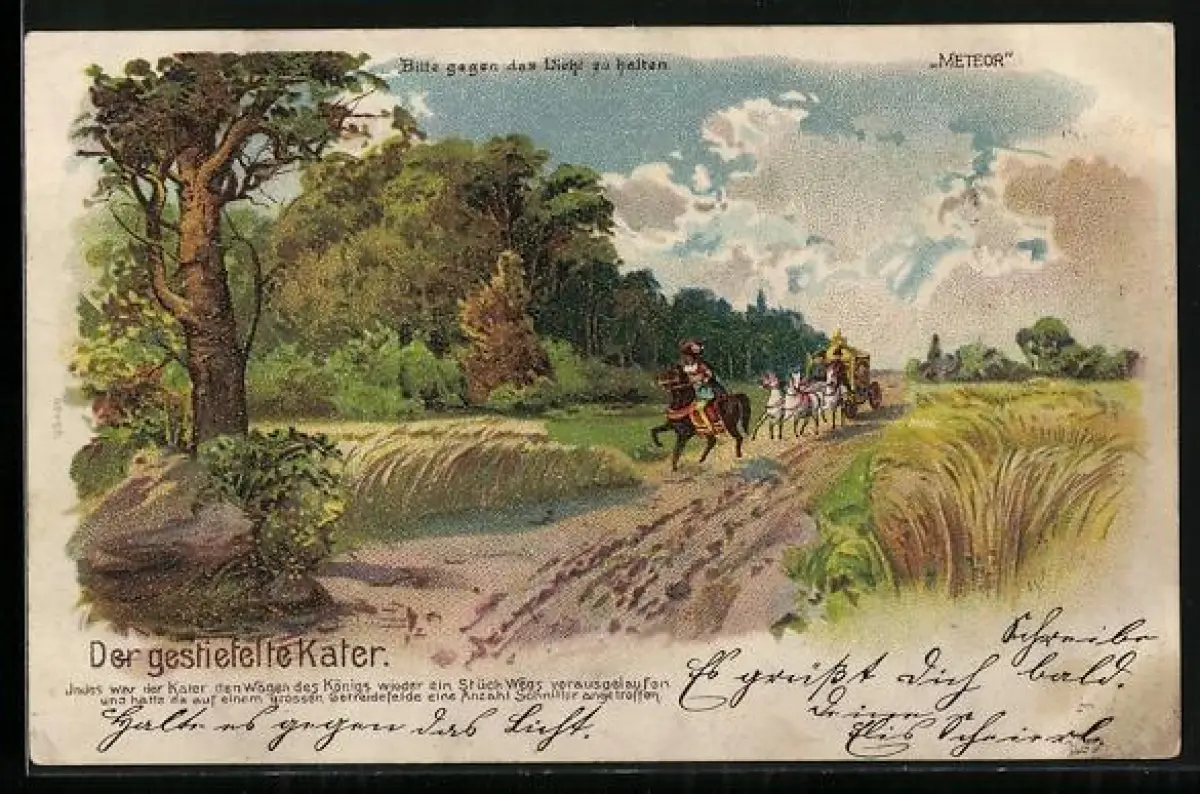 Lithographie Königskutsche beim Ausritt, Der gestiefelte Kater ist Ihnen voraus, Halt gegen das Licht