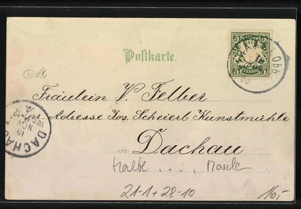 Personenbezogene Daten auf der Rückseite der Karte wurden durch blauen Textmarker unkenntlich gemacht. Die blauen Stellen sind auf die Vorderseite durchgeweicht und wirken sich negativ auf das Postkartenfoto aus