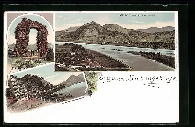 Lithographie Königswinter, Aussicht vom Rolandsbogen, Rolandseck und Drachenfels