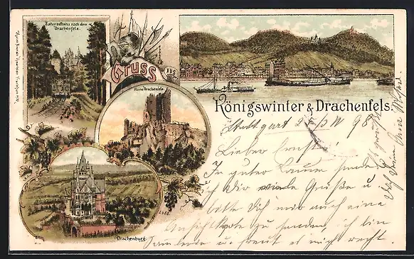Lithographie Königswinter, Drachenburg, Ruine Drachenfels und Zahnradbahn