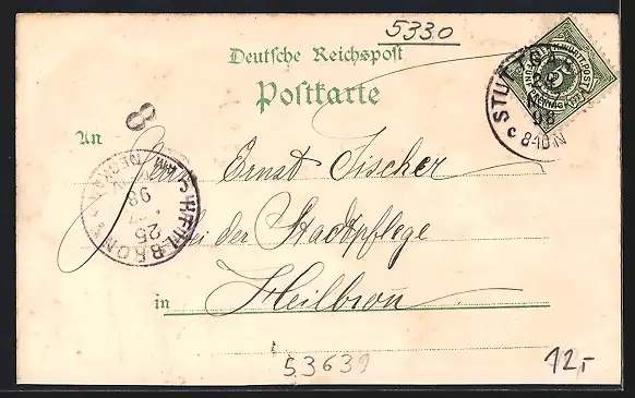 Personenbezogene Daten auf der Rückseite der Karte wurden durch blauen Textmarker unkenntlich gemacht. Die blauen Stellen sind auf die Vorderseite durchgeweicht und wirken sich negativ auf das Postkartenfoto aus
