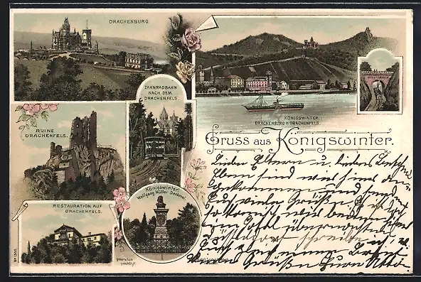 Lithographie Königswinter, Restaurant auf Drachenfels, Zahnradbahn