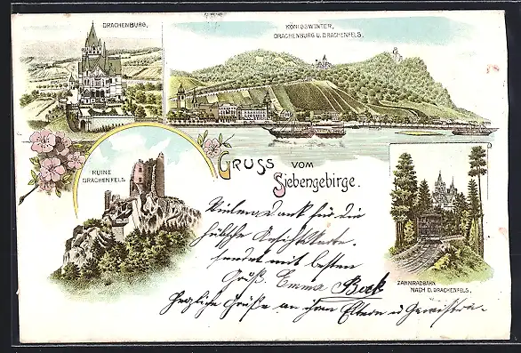 Lithographie Königswinter /Siebengebirge, Drachenburg, Ruine Drachenfels und Zahnradbahn