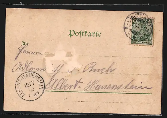 gelaufen 1900, rückseitig Klebe- und Papierreste, rückseitig Oberflächenschaden, guter Zustand