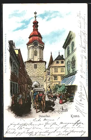 Lithographie Krems /Donau, Steinerthor, Pferdekutsche