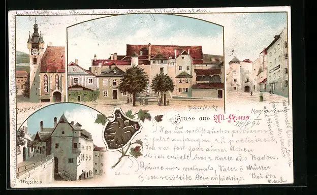 Lithographie Krems, Hoher Markt, Piaristenkirche, Wegscheid