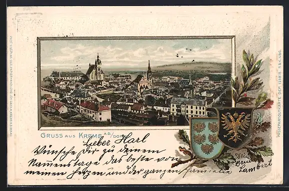 Lithographie Krems an der Donau, Ortsansicht, Wappen, Eichen- und Lorbeerzweig