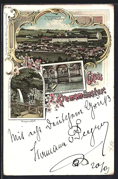 Lithographie Kremsmünster, Fischbehälter im Stift, Siegmundfall, Ortsansicht vom Gustermayrberg