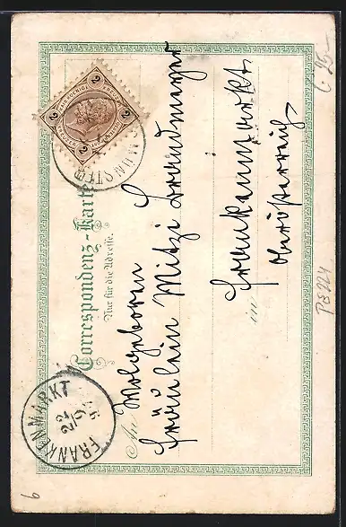 gelaufen 1897, Eckknicke li. unten und re. oben, Bugspur oben horizontal, guter Zustand