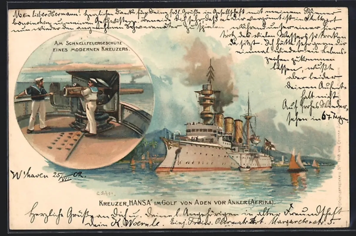 Lithographie Kreuzer Hansa im Golf von Aden vor Anker, Matrosen am Schnellfeuergeschütz