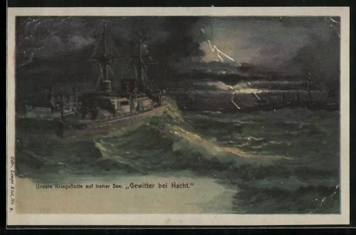 Lithographie Kriegsflotte auf hoher See bei nächtlichem Gewitter, Kriegsschiff
