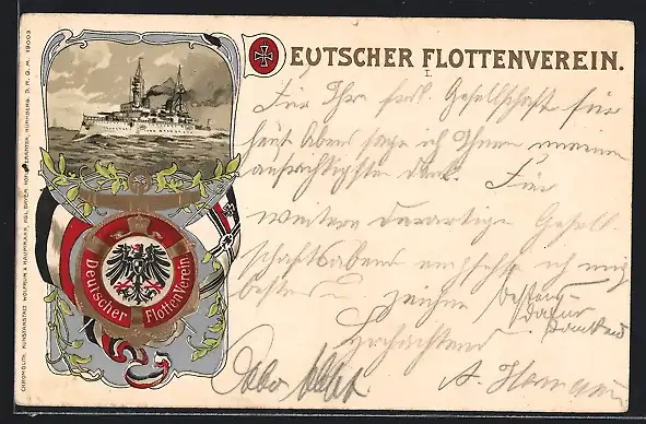 Lithographie Kriegsschiff, Deutscher Flottenverein, Reichskriegsfahne