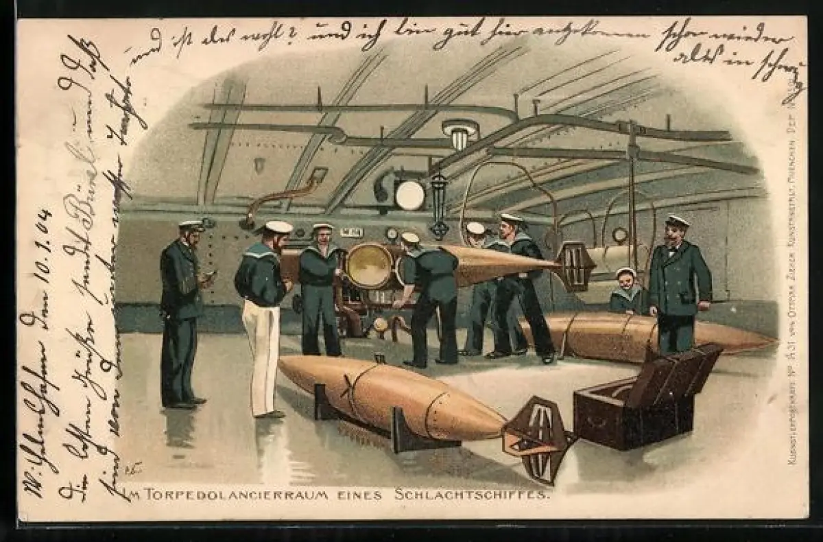 Lithographie Kriegsschiff, Matrosen im Torpedolancierraum eines Schlachtschiffes