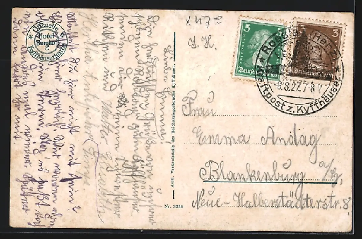 Personenbezogene Daten auf der Rückseite der Karte wurden durch blauen Textmarker unkenntlich gemacht. Die blauen Stellen sind auf die Vorderseite durchgeweicht und wirken sich negativ auf das Postkartenfoto aus