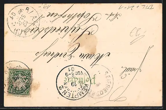 Personenbezogene Daten auf der Rückseite der Karte wurden durch blauen Textmarker unkenntlich gemacht. Die blauen Stellen sind auf die Vorderseite durchgeweicht und wirken sich negativ auf das Postkartenfoto aus