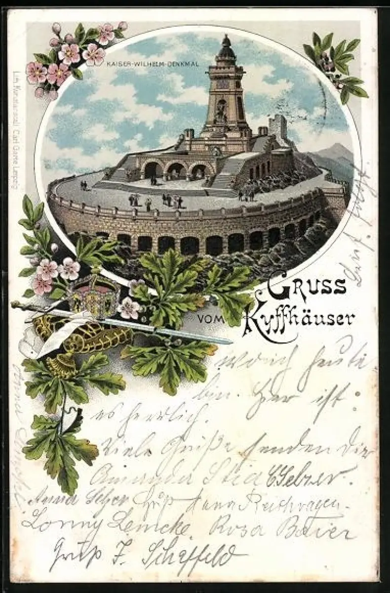 Lithographie Kyffhäuser, Menschen vor dem Kaiser-Wilhelm-Denkmal