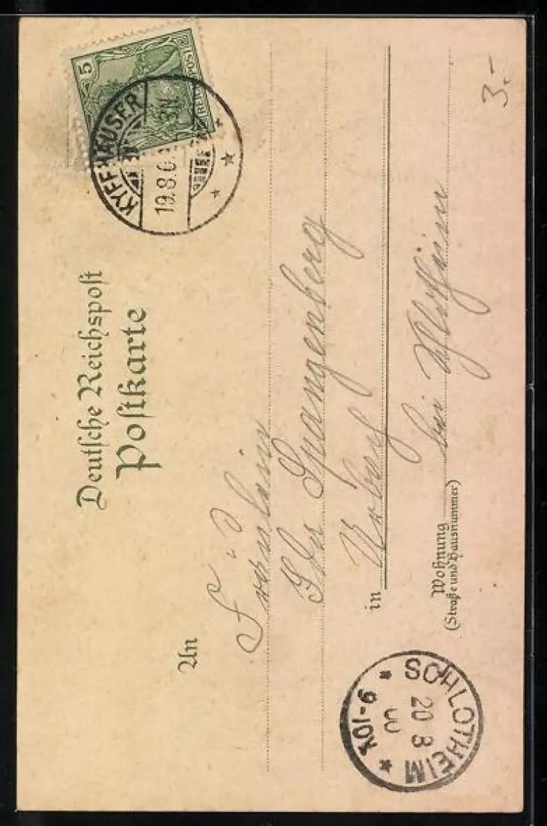 Personenbezogene Daten auf der Rückseite der Karte wurden durch blauen Textmarker unkenntlich gemacht. Die blauen Stellen sind auf die Vorderseite durchgeweicht und wirken sich negativ auf das Postkartenfoto aus