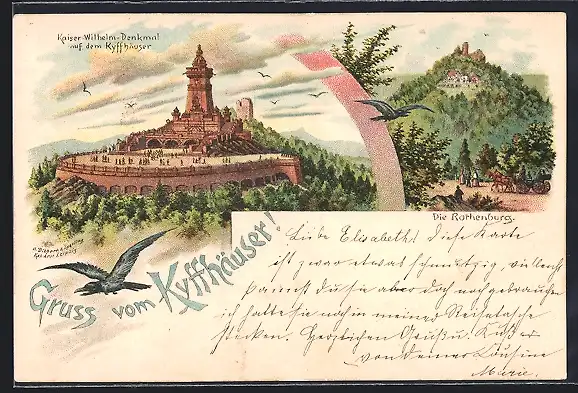 Lithographie Kyffhäuser, Motiv mit Kaiser Wilhelm-Denkmal und Rothenburg