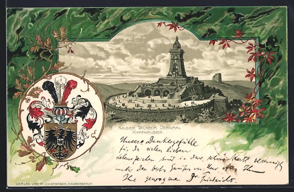 Lithographie Kyffhäuser, Wappen und Kaiser Wilhelm-Denkmal