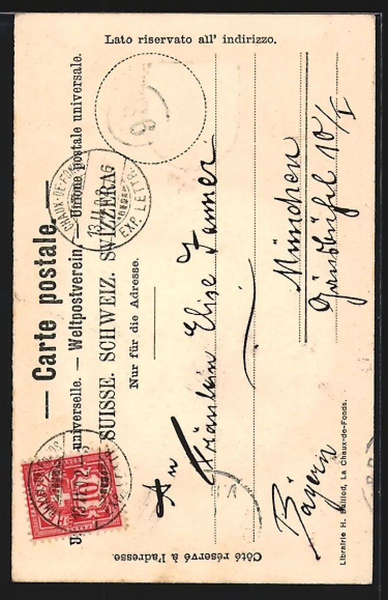 Lithographie La Chaux-de-Fonds, Rathausplatz mit Temple National, Wappen, Ornament-Rahmen