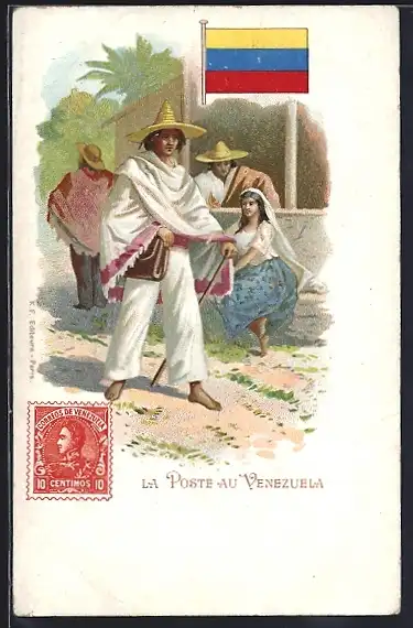 Lithographie La Poste au Venezuela, Postbote, Flagge, Briefmarke