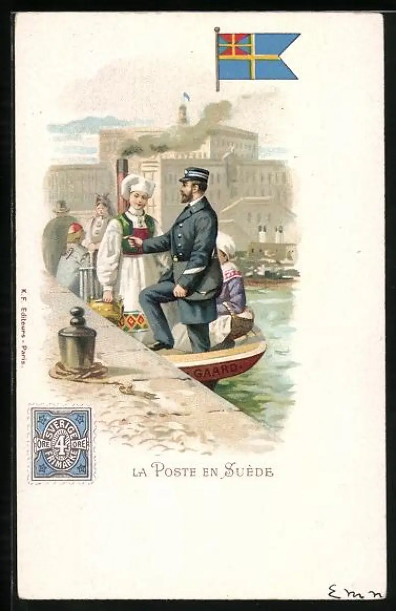 Lithographie La Poste en Suede, Postbote, Flagge, Briefmarke