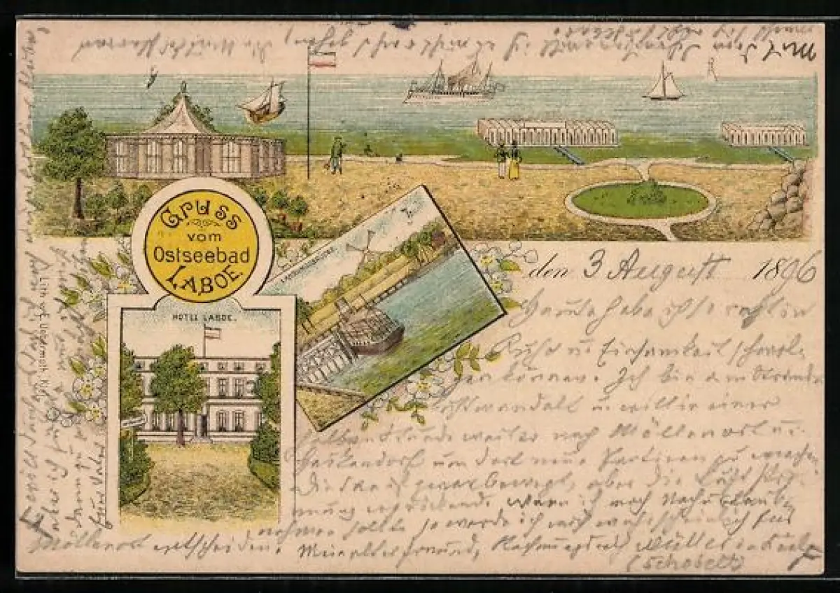Lithographie Laboe, Hotel Laboe, Landungsbrücke, Partie am Strand