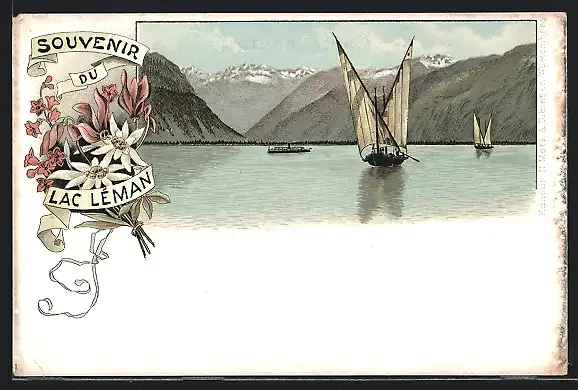 Lithographie Lac Léman, Segelboote und ein kleiner Dampfer auf dem See