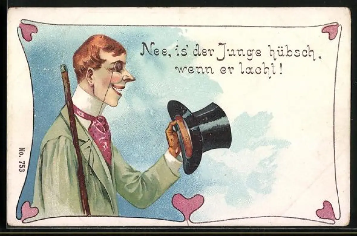 Lithographie Lachender Monokelträger spiegelt sich in seinem Zylinderhut
