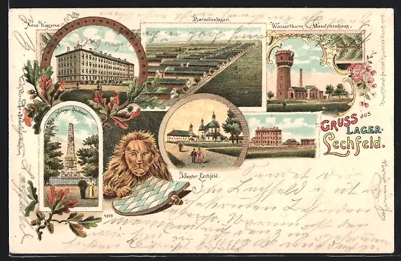 Lithographie Lager-Lechfeld, Barackenlager aus der Vogelschau, Garnisons Lazareth, Wasserturm mit Maschinenhaus