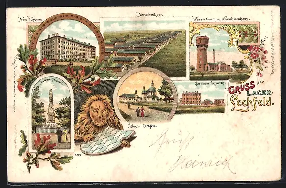 Lithographie Lager-Lechfeld, Barackenlager aus der Vogelschau, Garnisons Lazareth, Wasserturm mit Maschinenhaus