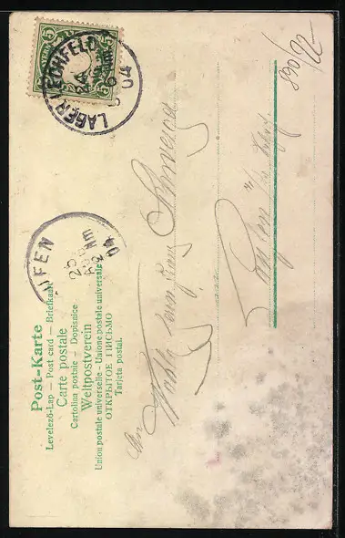 Personenbezogene Daten auf der Rückseite der Karte wurden durch blauen Textmarker unkenntlich gemacht. Die blauen Stellen sind auf die Vorderseite durchgeweicht und wirken sich negativ auf das Postkartenfoto aus
