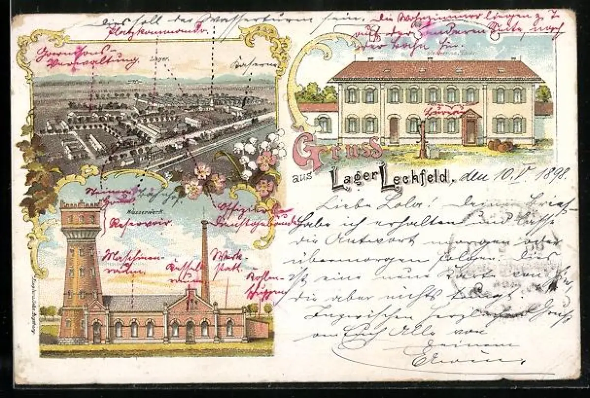 Lithographie Lager Lechfeld, Wasserwerk, Steinernes Haus, Teilansicht