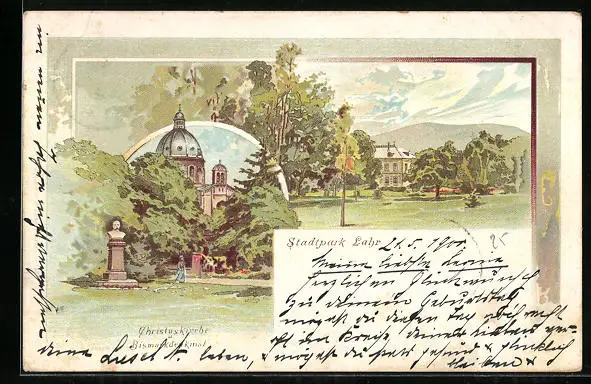 Lithographie Lahr, Blick in den Stadtpark, Christuskirche mit Bismarckdenkmal