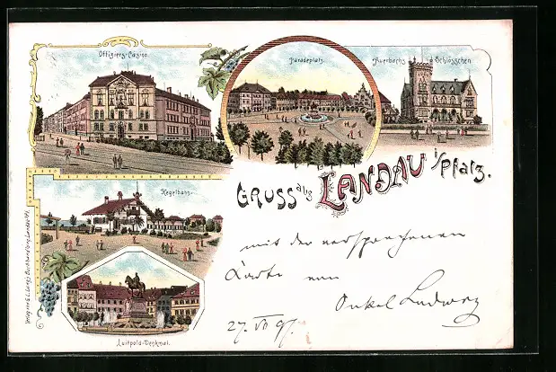 Lithographie Landau i. Pfalz, Ortsansicht mit Luitpold-Denkmal